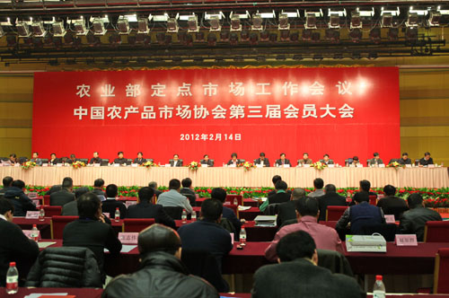 2012年2月14日,,中国农产品市场协会第三届会员代表大会在河南郑州隆重召开。。农业部、、中国农产品市场协会、、、各省(市)农业厅(局)、、、、农业部定点市场负责人相聚一堂,,,,总结了我国农产品流通和农产品市场建设情况,,选举产生了第三届协会领导班子和常务理事。。。。