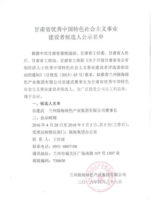 关于集团董事长岳建武同志为甘肃省优秀中国特色社会主义事业建设者候选人的公示